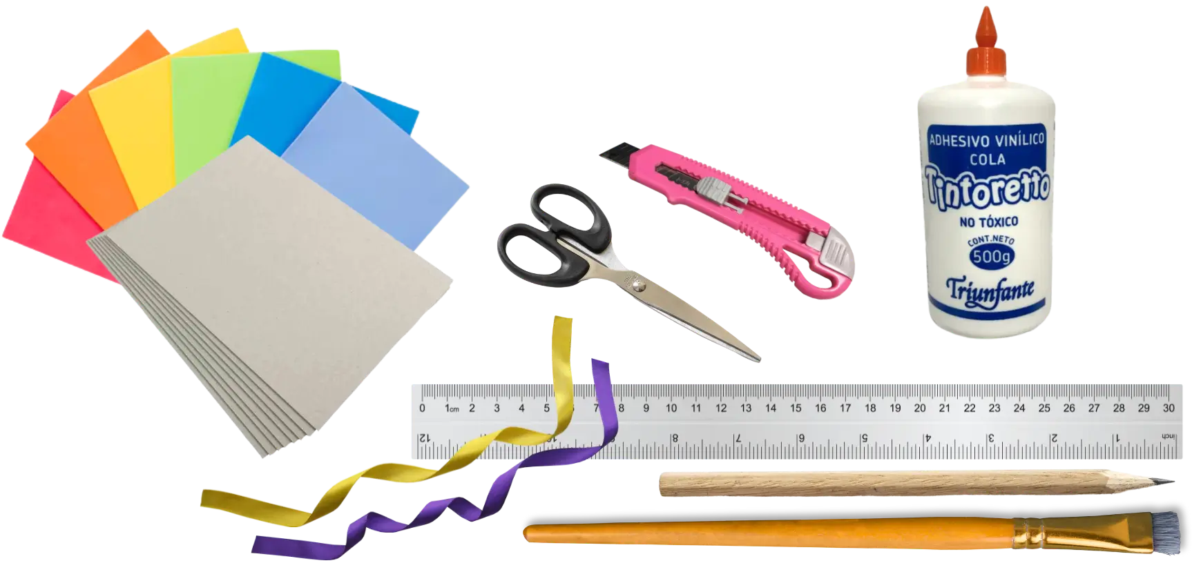 Comenzarás con materiales básicos y accesibles, la mayoría de ellos ya los tienes en tu casa (Tijera, cúter, regla, lápiz, pincel, adhesivo escolar, cartón, papel blanco o con diseños y cintas para decorar)